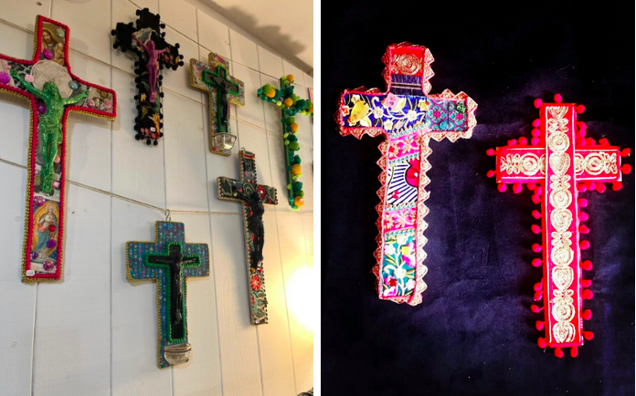 Plongé dans son univers Julie réalise des pièces anciennes revisitées avec poésie, crucifix, vierges…